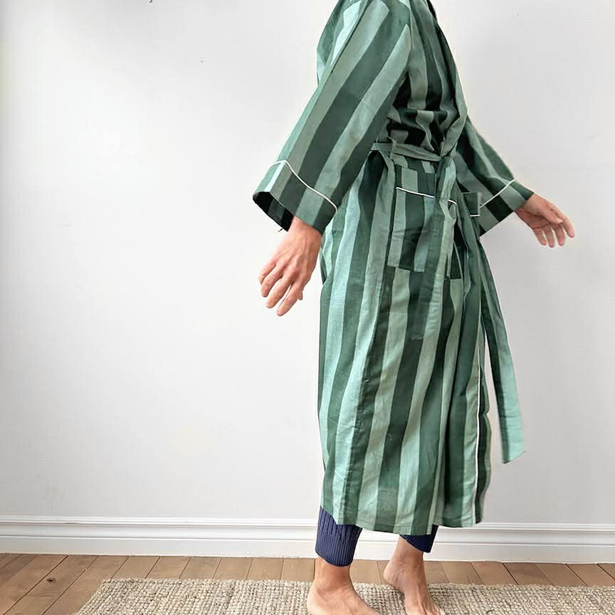 Long kimono-style dress in cotton with block print. Wear at home or over your favorite pair of jeans.