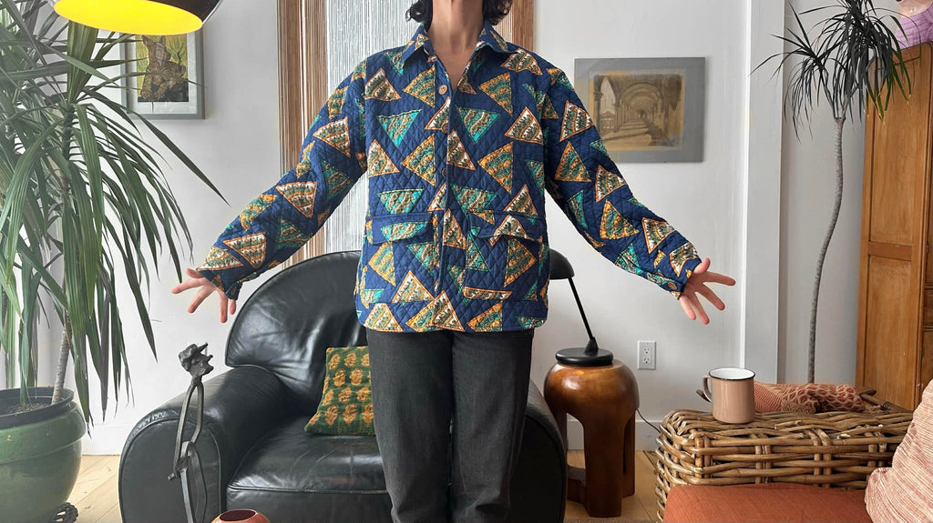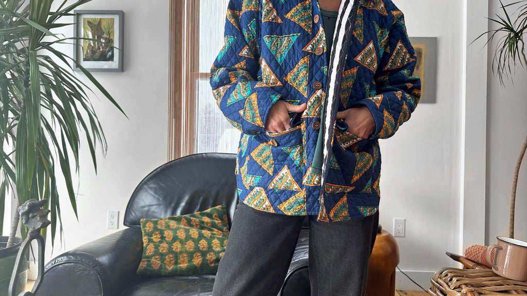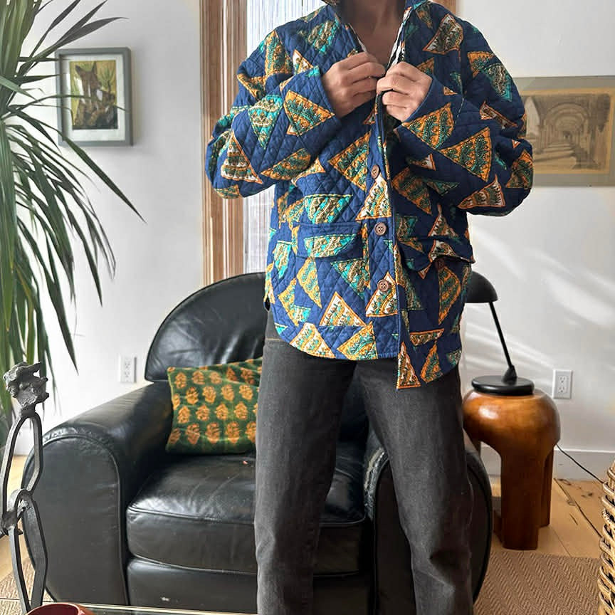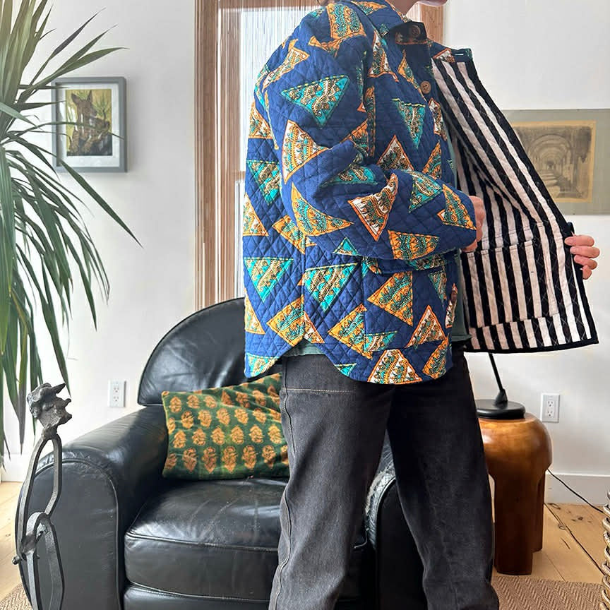 This quilted cotton shirt jacket is printed using block-print and/or silkscreen techniques.