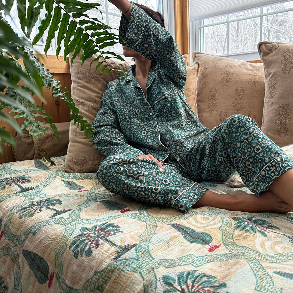 Collection of reversible quilted jackets and kimonos in natural materials, quilted cotton, velvet and block prints. Handmade, ethically and responsibly in collaboration with artisans.