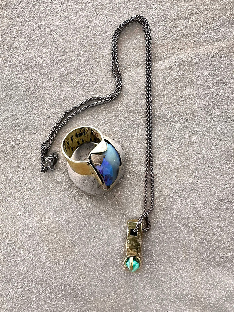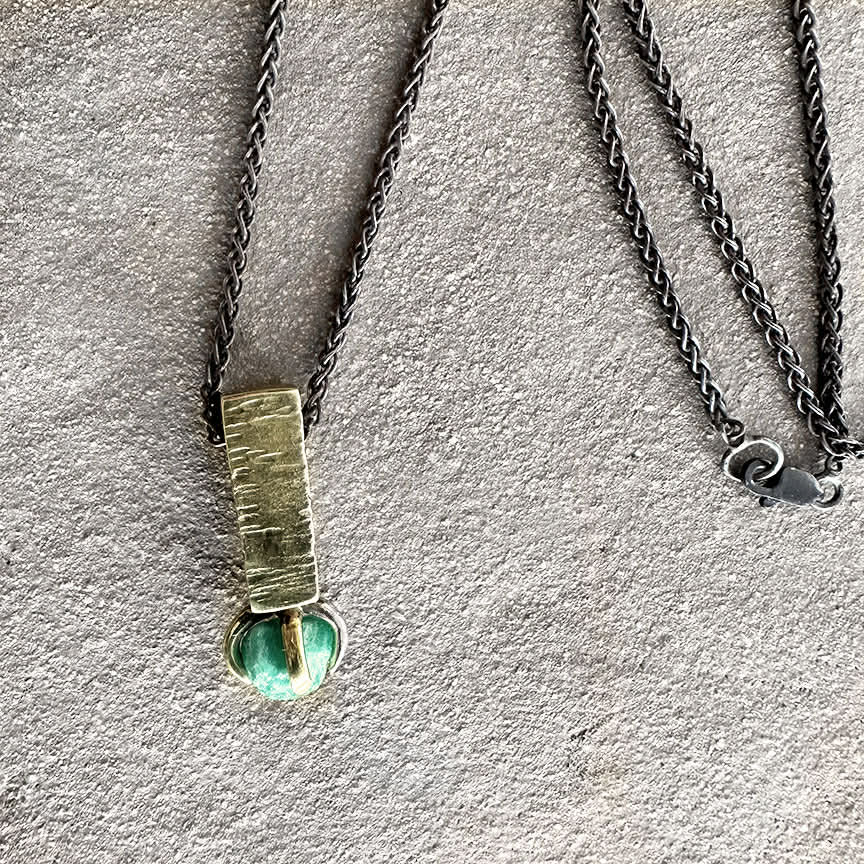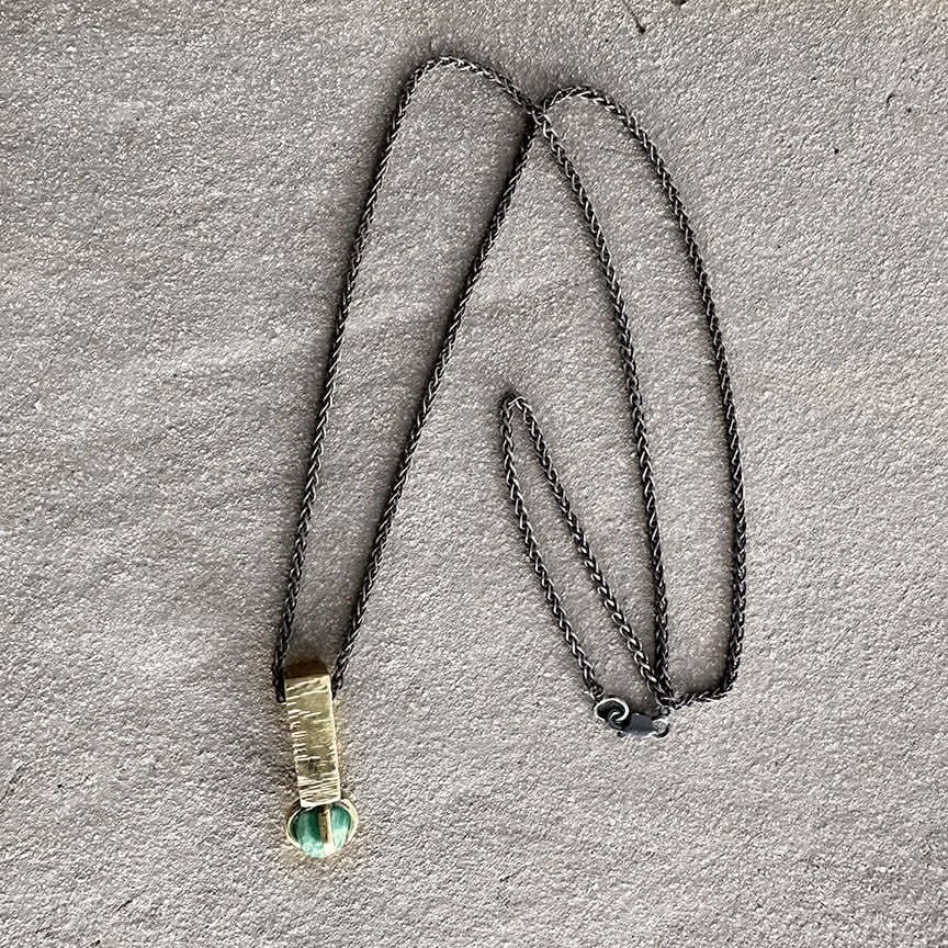 Oxidized silver chain and emerald and brass pendant (Colombia)