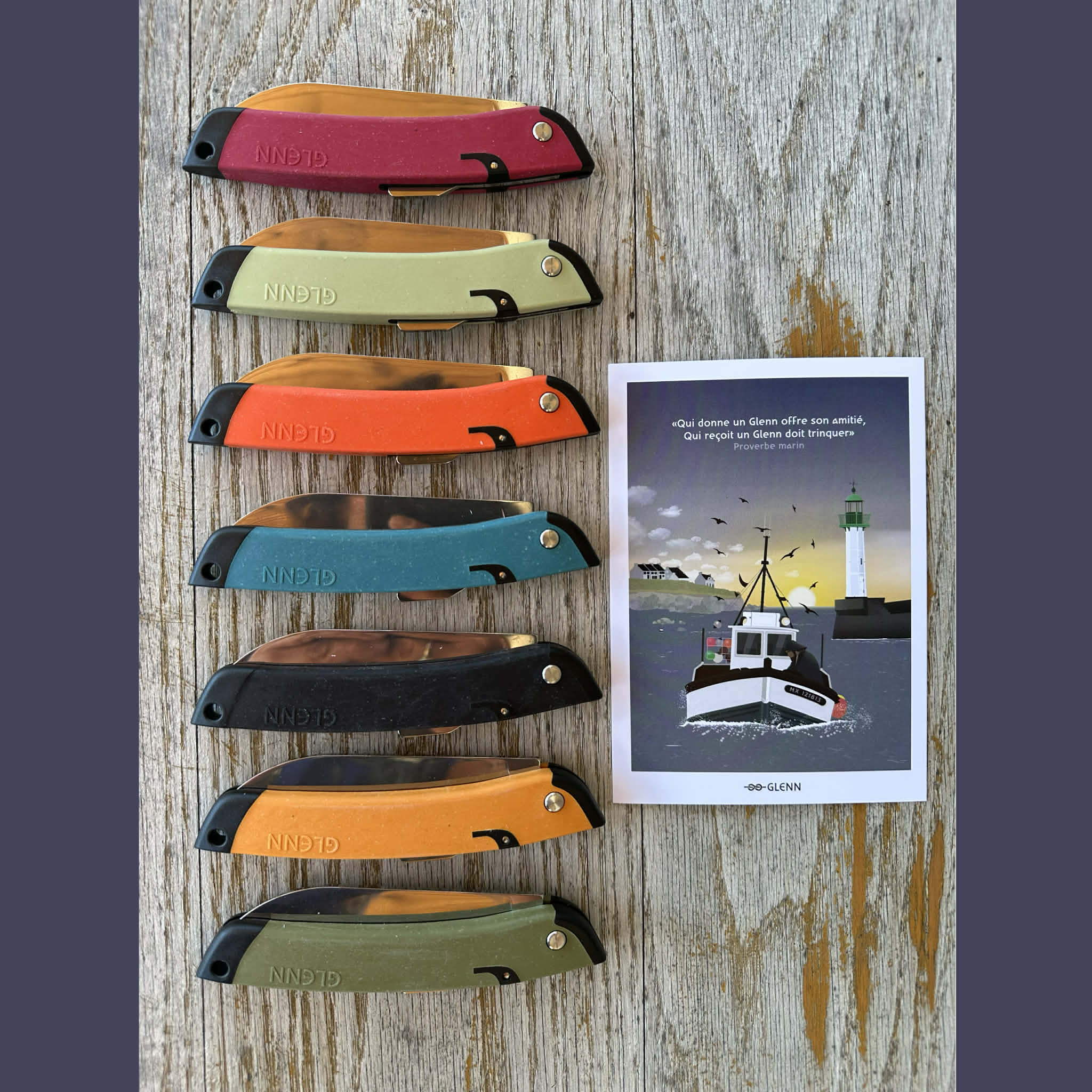 - Chaque Glenn est unique et numéroté. Les 2 premières lettres indiquent le port de provenance des filets de pêche recyclés et utilisés pour sa fabrication.